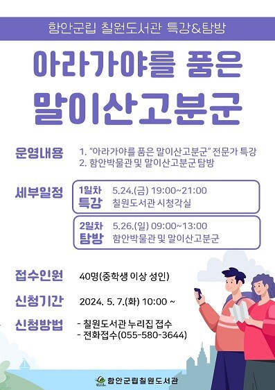 5월 24일(금) 오후 7시 칠원도서관에서 전문가 특강을 진행하며, 이틀 뒤인 5월 26일(일)에는 오전 9시 칠원도서관에서 함께 출발해 문화관광해설사의 안내로 함안박물관과 세계유산인 말이산고분군을 둘러볼 예정이다.