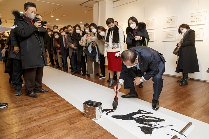 서울 마포구가 3일 ‘2022년 새해희망글씨전’ 개막식을 열었다. 전시 내용은 새해맞이 덕담과 좋은 글 등이며, 3~16일은 마포문화재단에서, 오는 17일부터 2월13일까지는 광흥당에서 만나볼 수 있다. 사진은 개막식에서 유동균 구청장(오른쪽)이 새해 덕담을 쓰고 있는 모습. (사진제공=마포구청)