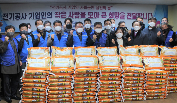 서울 양천구 신정7동 주민센터는 최근 한국전기공사협회 서울남부회로부터 함께하는 이웃돕기 기부물품으로 취약계층이 많은 신정7동 임대아파트 주민을 위한 쌀(10kg)·143포(500만원 상당)를 전달받았다. 사진은 전달식에서 관계자들이 기념촬영을 하는 모습. (사진제공=양천구청)