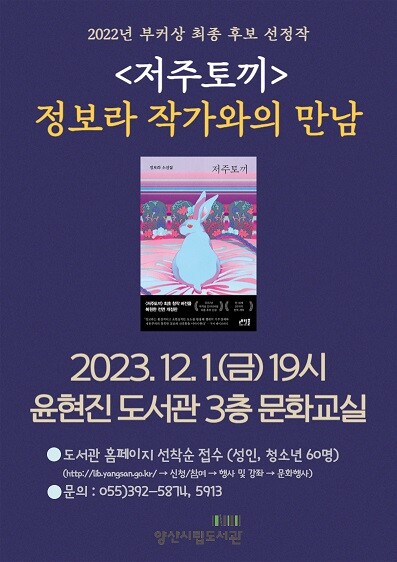 <저주토끼>는 정보라 작가의 소설집으로 2022년 부커상 인터내셔널 최종 후보에 선정된 바 있으며, 전 세계 20개국에서 번역 계약된 작품이다. 정보라 작가는 예일대에서 러시아 동유럽 지역학 석사, 인디애나대에서 슬라브 문학 박사를 취득한 후, 대학에서 강의도 하고, SF와 환상 문학을 쓰고 번역하기도 한다.