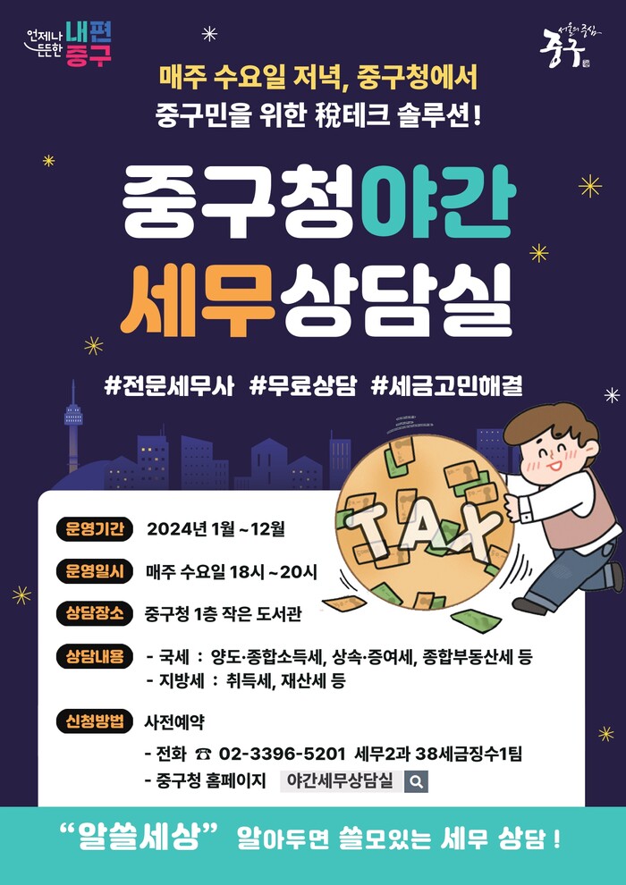 [시민일보 = 여영준 기자] 중구(구청장 김길성)는 ‘야간 세무상담실’을 운영하고 있다고 밝혔다.