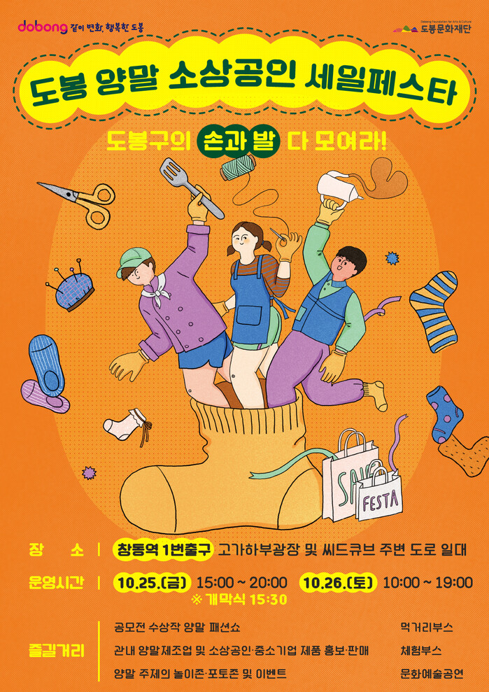 [시민일보 = 문민호 기자] 도봉구(구청장 오언석)가 오는 25~26일 창동역 1번 출구 고가하부 광장 및 씨드큐브 주변 도로 일대에서 ‘도봉 양말ㆍ소상공인 세일 페스타’를 개최한다.