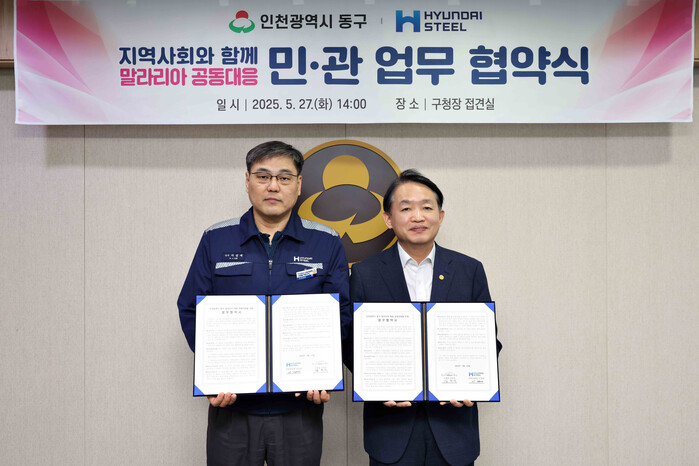 [인천=문찬식 기자] 인천 동구(구청장 김찬진)는 27일 구청 접견실에서 현대제철 인천공장과 ‘말라리아 예방을 위한 업무협약(MOU)’을 체결했다고 밝혔다.