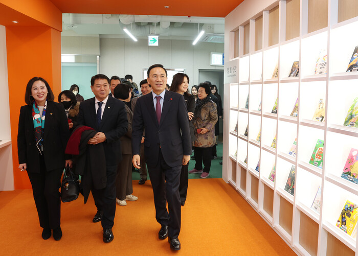 | ▲ 논현문화마루 개관식에 참석한 조성명 구청장(오른쪽)이 논현문화마루 내부를 둘러보고 있다. (사진=강남구청 제공) |