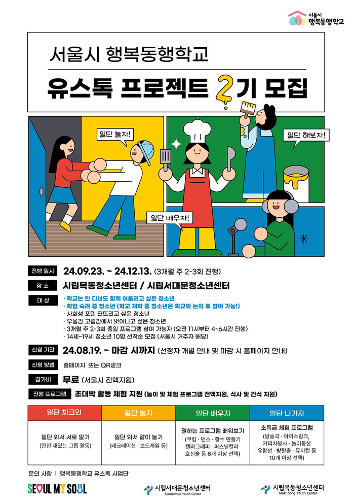 유스톡! 프로젝트는 9월 24일부터 12월 4일까지 약 3개월간 진행되며, 매주 2~3회의 프로그램이 시립목동청소년센터와 시립서대문청소년센터에서 운영된다. 프로그램의 주요 내용은 체험 활동과 놀이를 통해 청소년들이 서로의 생각과 감정을 공유하고, 자연스럽게 관계를 맺을 수 있도록 돕는 것이다. 이 과정에서 청소년들은 자신의 고민을 털어놓고, 또래 친구들과 함께 문제를 해결해 나가는 소통의 장을 경험하게 된다.
