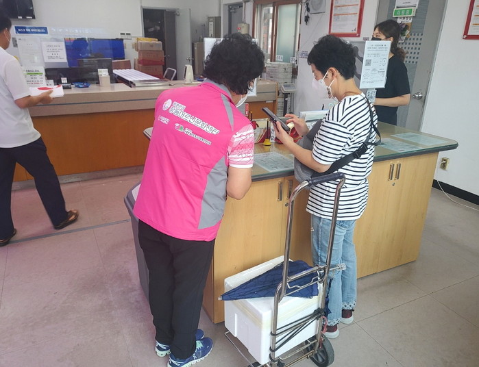 | ▲ 도봉디지털튜터 서포터즈가 우체국에 방문객에게 스마트폰 간편 사전접수 방법을 알려주고 있다. (사진제공=도봉구청) |