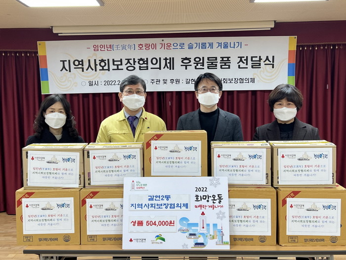 서울 은평구 갈현2동은 지역사회보장협의체로부터 최근 겨울철 어려움을 겪는 중장년과 청년 가구를 위한 식료품 10박스를 전달받았다. 식료품은 실직과 휴·폐업으로 고용난에 시달리고 건강마저 좋지 못한 중장년 1인 및 청년 가구에 전달될 계획이다. 사진은 전달식에서 관계자들이 기념촬영을 하는 모습. (사진제공=은평구청)