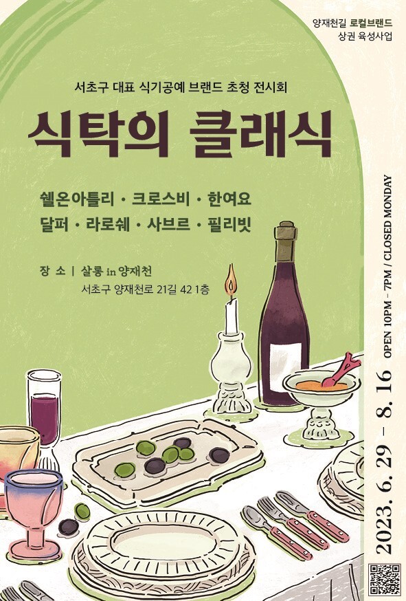 전시는 ‘양재천천마켙’에서 발굴한 서초구 신진작가인 테이블웨어 브랜드 '쉘 온 아틀리’, 도자기 브랜드 '한여요’와 상권 내 친환경 와인 브랜드 '크로스비’, 커트러리와 테이블웨어 브랜드 '달퍼', '라로쉐', '사브르', '필리빗' 등 총 7개 업체가 참여해 100여 점의 공예품을 전시·판매한다.