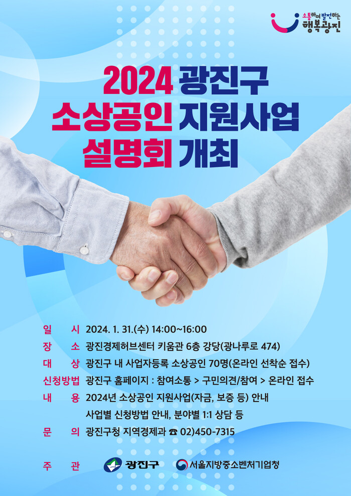 [시민일보 = 여영준 기자] 광진구(구청장 김경호)가 오는 31일 지역 경영인을 위한 주요 정책을 소개하는 ‘2024년 광진구 소상공인 지원사업 설명회’를 개최한다.