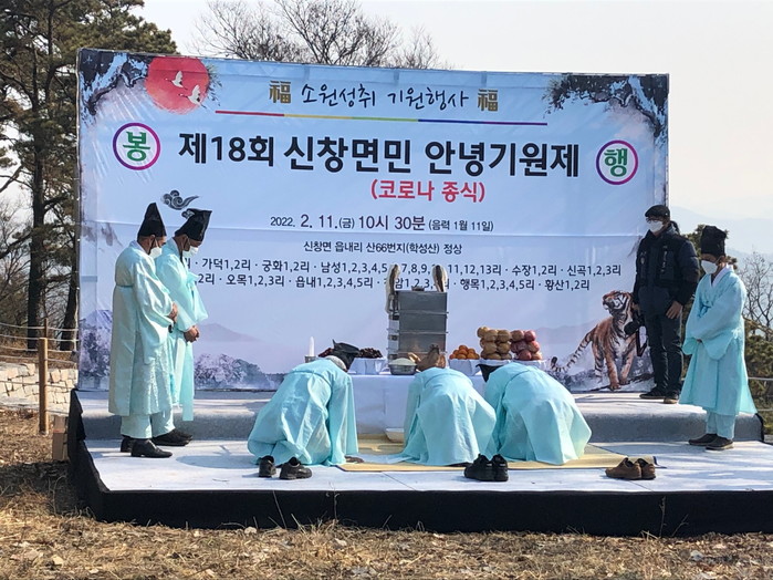 충남 아산시 신창면민 안녕기원제 추진위원회는 최근 신창면 읍내리 학성산 정상에서 '제18회 신창면민 안녕기원제(코로나 종식)'를 봉행했다. 이번 기원제는 참석자들의 소원 적기 등으로 시작했으며, 코로나19가 종식되길 바라는 신창면민의 마음을 담아 진행됐다. 사진은 기원제가 진행 중인 모습. (사진제공=아산시청)