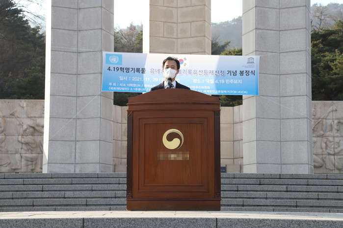 서울 강북구 수유동 국립 4.19민주묘지에서 29일 유네스코 세계기록유산 등재 신청 봉정식이 열렸다. 등재대상 기록물은 4.19혁명 당시 학생과 시민들의 항거활동부터 부정선거, 피해자보상, 민주주의 확장까지 관련해 기록하고 생산한 자료 일체다. 사진은 봉정식에서 박겸수 구청장이 감사 인사말을 하고 있는 모습. (사진제공=강북구청)
