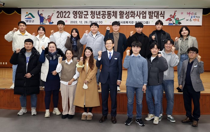 | ▲ 우승희 영암군수(앞줄 가운데)가 지난 26일 영암군종합사회복지관 대강당에서 열린 청년공동체 활성화사업 발대식에 참석해 참여 청년들과 사업성공을 위한 기념촬영을 하고 있다. / 영암군 제공 |