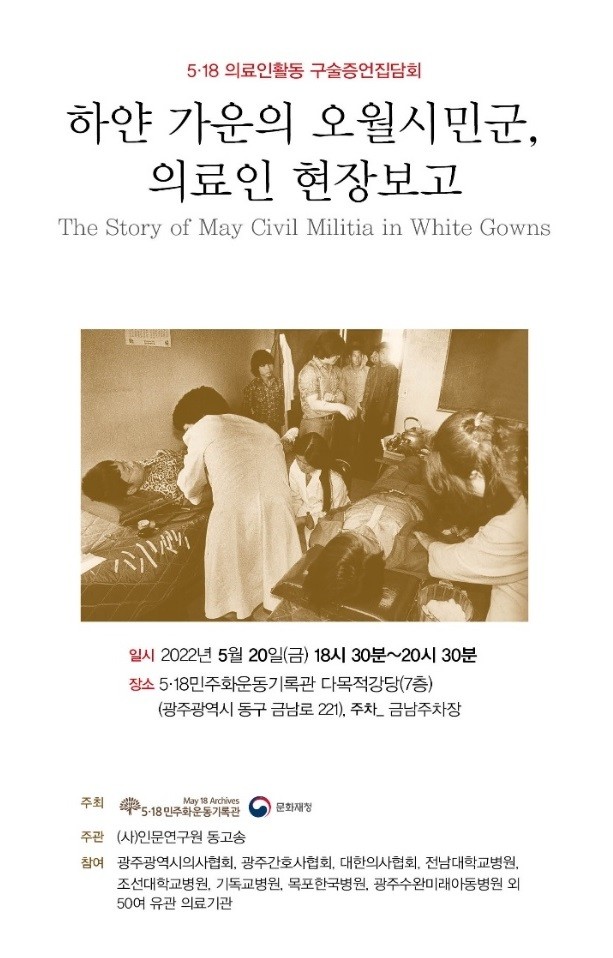 이번 집담회는 인문연구원 동고송과 광주시의사협회가 5‧18기록관과 함께 5·18 의료인 활동을 재조명하기 위해 마련했으며, 광주시 의사협회를 비롯한 50여 개 의료단체가 참여했다.