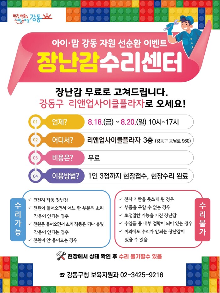 [시민일보 = 이대우 기자] 강동구(구청장 이수희)가 고물가 시대에 고장난 장난감을 무료로 수리해주는 ‘장난감 수리센터’를 오는 18~20일 시범운영한다.