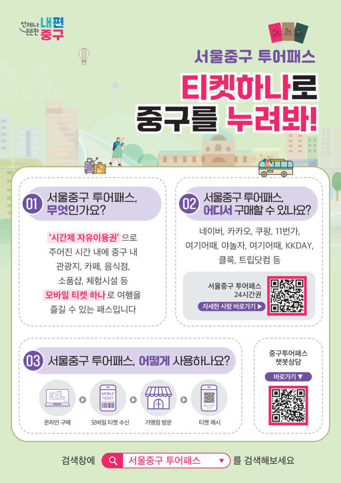 구 관계자는 “서울시 자치구 중 최초로 투어패스를 정식 출시하게 돼 매우 뜻깊다”라며 “관광객들에게 편리하고 풍성한 여행 경험을 제공하는 것은 물론, 중구 지역 경제에도 활력을 불어넣는 계기가 될 것”이라고 밝혔다.