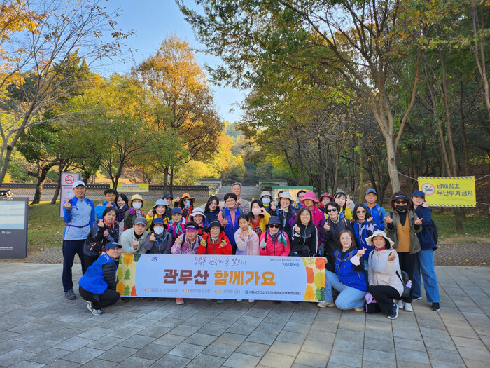 ‘관무산으로 가요’는 능곡행복건강센터 운영위원회가 지역주민의 건강 활동 증진을 위해 마련됐다. 행사 시작 전 모든 참가자는 함께 스트레칭을 하며 안전사고를 예방하는 데 신경을 썼다. 운영위원회는 관무산 환경정화를 위해 직접 쓰레기를 주우며 쾌적한 등산로 조성에 힘을 쏟았다.