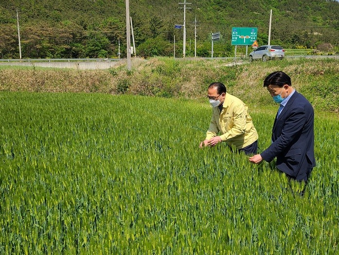 | ▲ 김기수 해남군농업기술센터소장, 관계직원과 맥류단지 붉은곰팡이병 현장점검 / 사진=해남군 제공 |