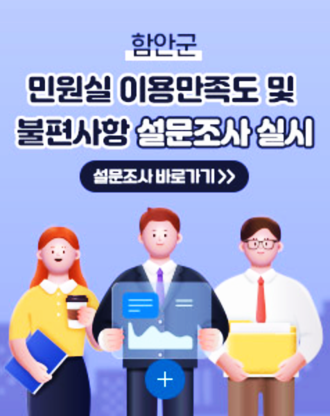 참여 방법은 군청 누리집 설문조사 게시판에 접속하거나 함안군청 1층 종합민원과에서 QR코드를 통해 설문조사에 참여할 수 있으며, 조사 결과는 민원 행정서비스 품질 향상을 위한 기초자료로 활용될 예정이다.