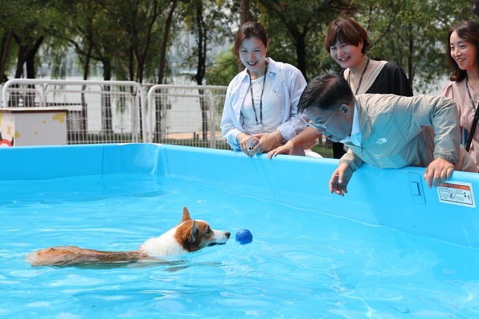 박강수 마포구청장은 지난 23일 ‘반려동물 캠핑장 홍보단’으로 활동할 반려견 동반 가족을 격려하기 위해 마포 반려동물 캠핑장을 찾았다. 사진은 박 구청장(오른쪽)이 반려동물 캠핑장에 조성된 물놀이장에서 수영하고 있는 강아지를 바라보고 있다. (사진=마포구청 제공)