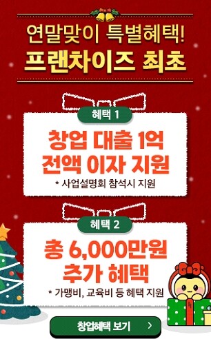 해당 프로모션은 연말을 맞아 벌툰에서 준비한 12월 한정 특별 프로모션으로 창업 대출 1억에 대한 이자 전액 지원과 함께 가맹비 면제, 교육비 면제 등 총 6천만원 상당의 창업 혜택을 추가로 제공한다.