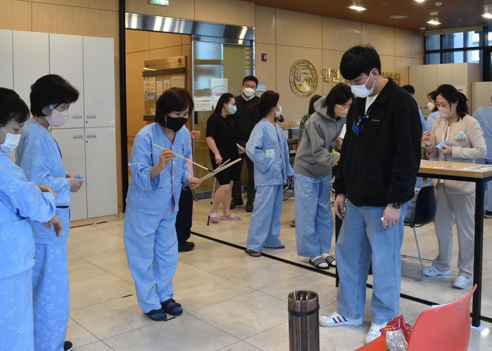 | ▲ 인천자생한방병원 '설 맞이 행사'에 참여한 환자들이 투호 경기에 집중하고 있다. (사진=자생한방병원 제공) |