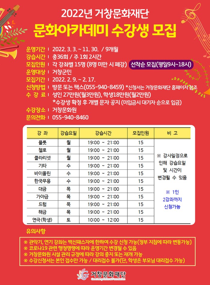 거창문화재단(이사장 구인모 거창군수)은 악기, 연극, 무용 등 다양한 문화예술 체험을 위해 2월 9일부터 17일까지 ‘2022년 문화아카데미’ 수강생을 선착순 모집한다.