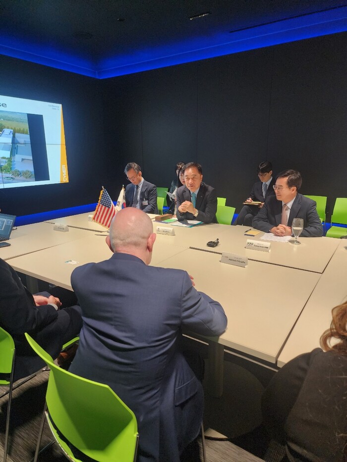 | ▲ ※사진 설명: ) 미국 반도체 관련 기업에 방문해 기업 측의 투자설명을 듣고 있는 모습 |
