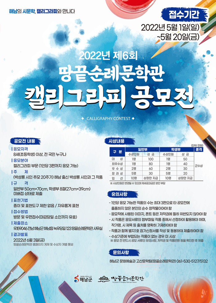 올해로 6회째인 공모전은 해남의 문인과 작품을 널리 알리고 문학작품과 캘리그라피의 만남을 통한 새로운 문학 감상의 기회로 큰 호응 속에 매년 개최되고 있다.