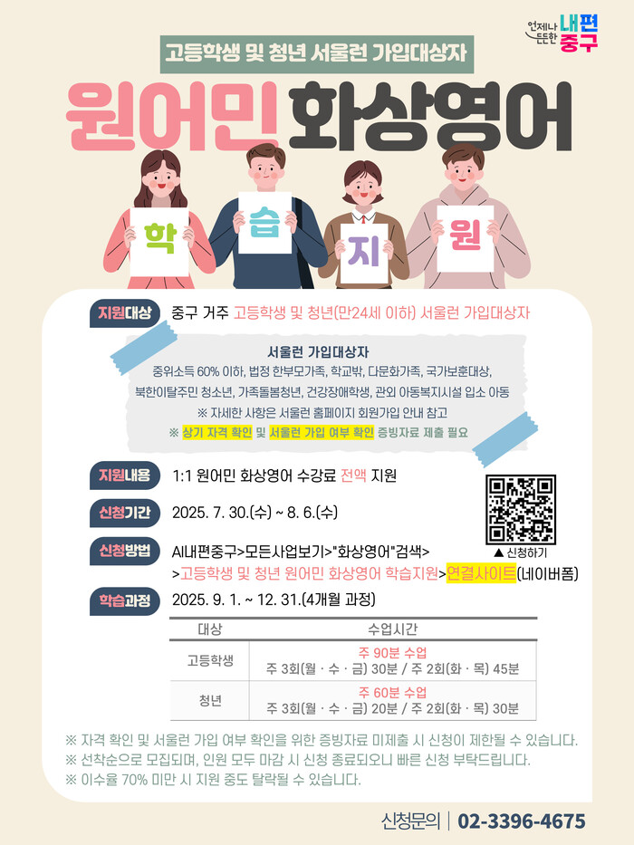 이번 사업은 구가 서울시의 ‘2025 원어민 화상영어 시범사업 공모’에 선정돼 추진하게 됐다. 구는 이를 통해 교육 소외계층의 학습 격차를 줄이고, 글로벌 역량을 갖춘 인재로 성장할 수 있도록 적극 지원할 계획이다.