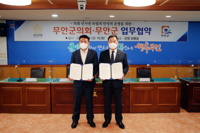 무안군의회와 무안군은 지난 3일 무안군청 상황실에서 무안군의회 인사권 독립의 안정적 추진을 위한 업무협약을 체결했다.