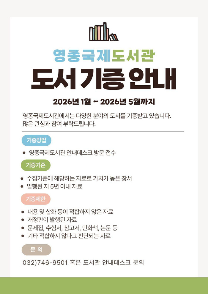 캠페인 참여 희망자는 영종국제도서관 공식 홈페이지 공지사항을 참고하거나, 도서관 대표 전화로 문의 후 안내된 방법에 따라 도서를 기증하면 된다.