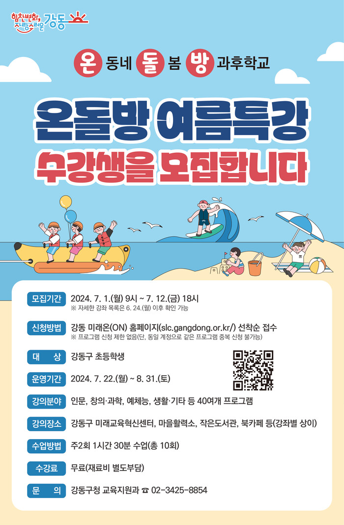 [시민일보 = 이대우 기자] 서울 강동구(이수희 구청장)가 관내 초등학생을 대상으로 ‘온동네돌봄방과후학교’(이하 온돌방) 여름특강 수강생을 모집한다고 전했다.