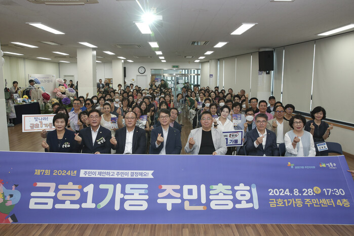 성동구 금호1가동 주민자치회는 최근 제7회 금호1가동 주민총회를 성공적으로 개최했다. 금호1가동 주민총회는 하모니카와 오카리나 연주로 시작돼 개회 선언, 내빈 축사, 주민 대표 소감 발표, 주민자치회 현황 및 활동 내역 공유 등의 순으로 진행됐다. 사진은 정원오 구청장(앞줄 왼쪽 네 번째)과 참석자들이 기념촬영을 하고 있는 모습. (사진=성동구청 제공)