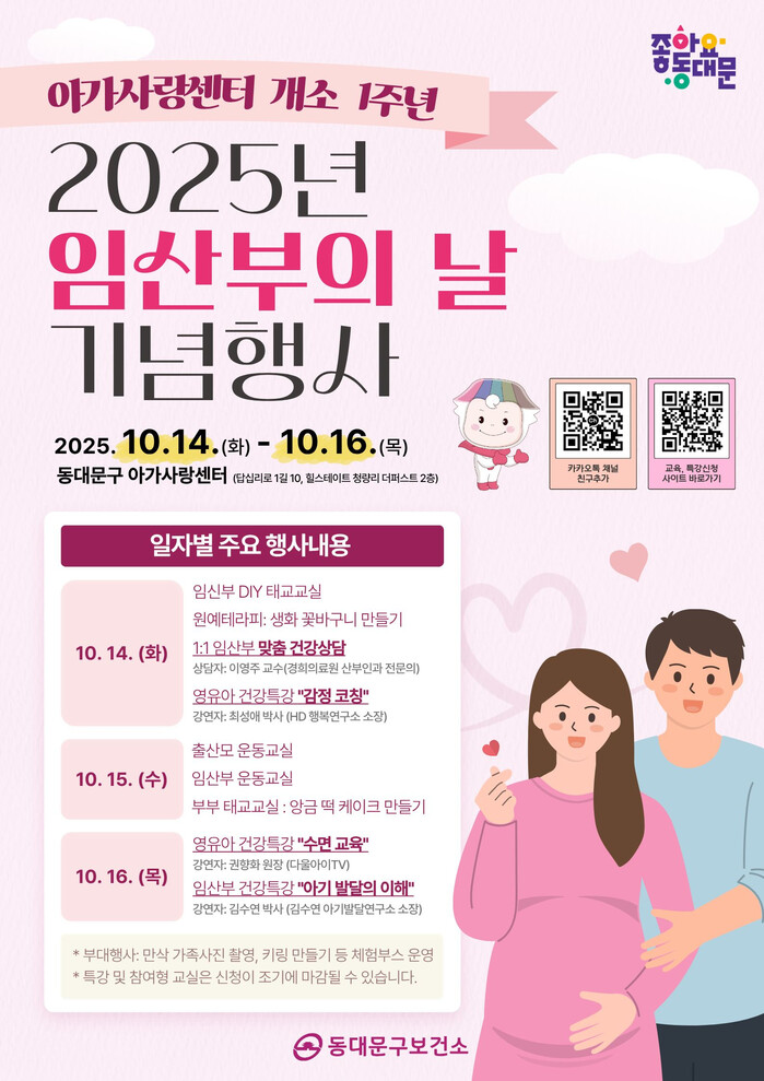 [시민일보 = 이대우 기자] 동대문구(구청장 이필형)가 오는 14~16일 아가사랑센터 개소 1주년과 ‘2025년 임산부의 날’을 맞아 다양한 기념행사를 개최한다.
