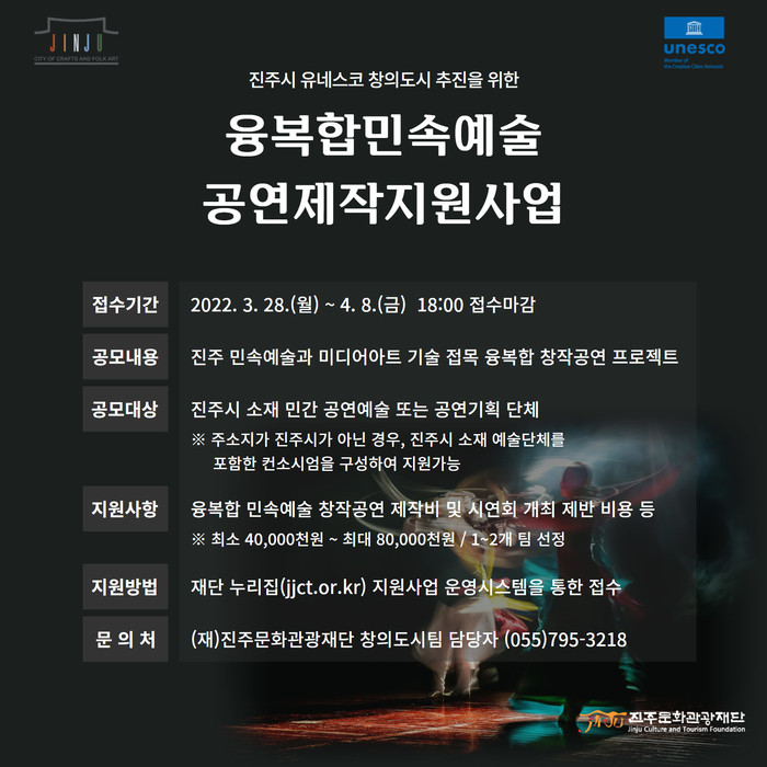 진주문화관광재단은 유네스코 창의도시 진주 추진 사업의 일환으로 2022년 「융복합민속예술공연제작지원사업」공모에 참여할 예술단체를 모집한다.
