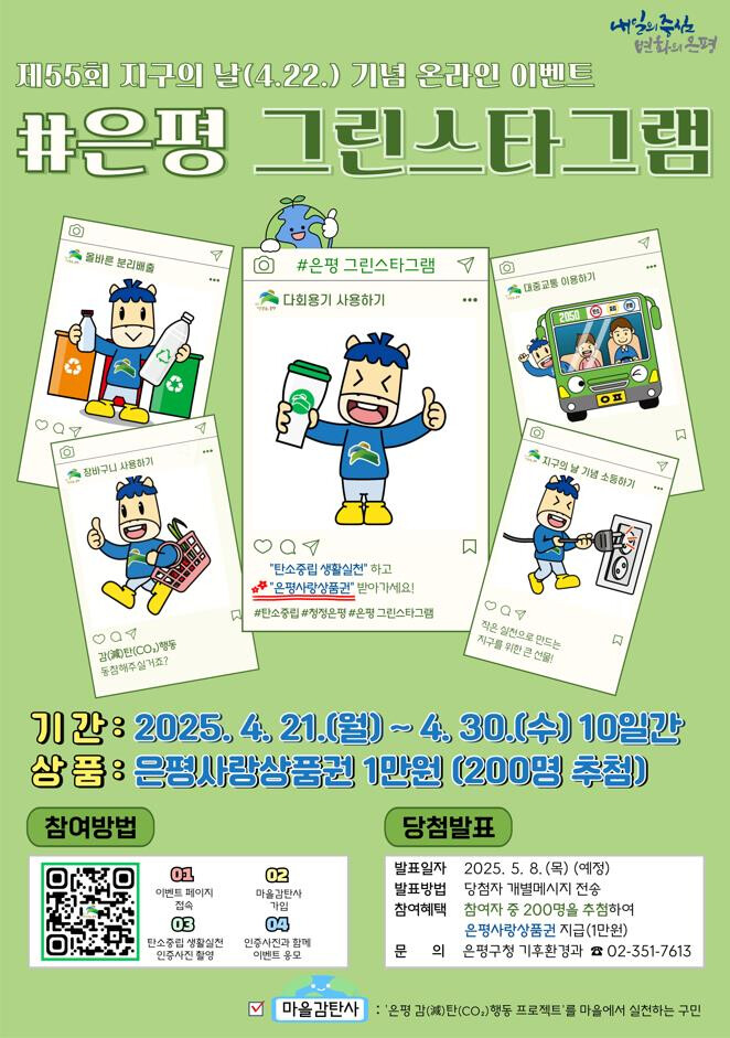 [시민일보 = 이대우 기자] 은평구(구청장 김미경)는 제55회 지구의 날(4월22일)을 맞아 오는 21~30일 ‘#은평 그린스타그램’ 온라인 이벤트를 진행한다고 14일 밝혔다.