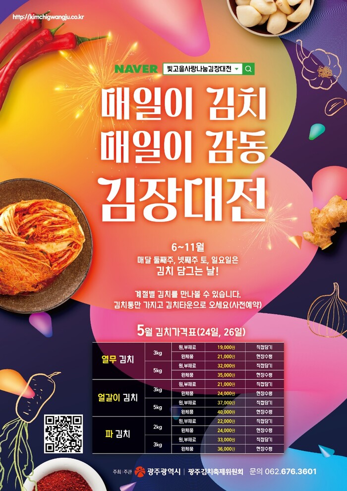 광주광역시(시장 강기정)는 오는 23일부터 26일까지 광주김치타운 다목적체험관 등에서 ‘매일이 김치! 매일이 감동!’이라는 주제로 ‘봄 햇김치 사랑나눔 행사’를 연다.