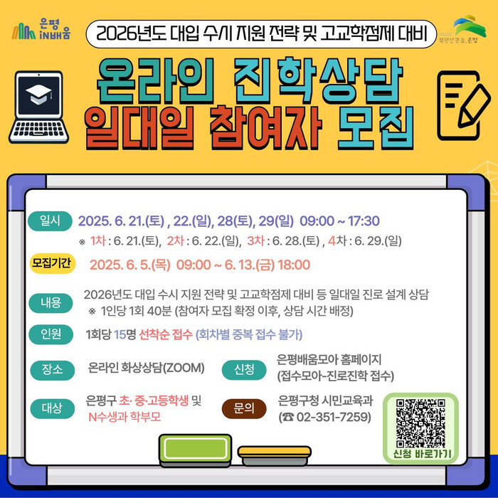 [시민일보 = 이대우 기자] 서울 은평구(구청장 김미경)가 2026년도 대입 수시 지원 전략과 고교학점제 대비를 위한 일대일 진로·진학 컨설팅을 방문 상담과 동시에 온라인 상담까지 확대 시행한다.