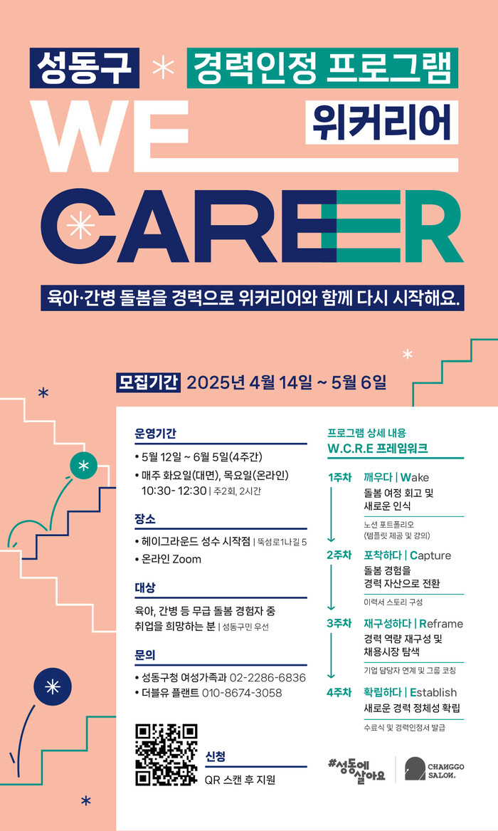 [시민일보 = 박소진 기자] 성동구(구청장 정원오)는 돌봄활동으로 인한 경력단절 경험을 사회적 자산으로 전환하고 재도약의 기회를 제공하기 위한 경력인정프로그램 ‘위커리어(WeCareer)’를 운영한다.