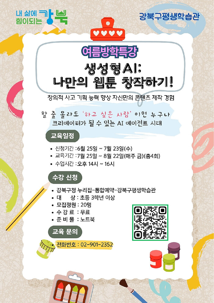 [시민일보 = 문민호 기자] 강북구(구청장 이순희)는 여름방학을 맞아 지역 청소년들을 위한 진로탐색 체험 프로그램 '나만의 웹툰 창작하기'를 운영한다고 11일 밝혔다.