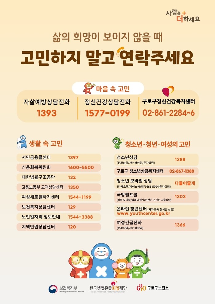 우울감 등 말하기 어려운 고민이 있거나 주변에 이런 어려움을 겪는 가족, 지인이 있다면 자살 예방 상담 전화, 정신 건강 상담 전화, 희망의 전화에서 24시간 전문가의 상담을 받을 수 있다.