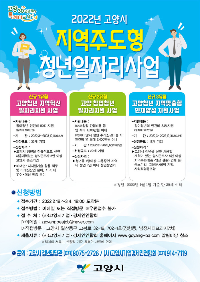 자세한 내용은 고양시 홈페이지 새소식.고시공고에서 확인할 수 있으며 기타 궁금한 사항은 고양시 청년담당관 또는 고양시 기업‧경제인연합회로 문의하면 된다.