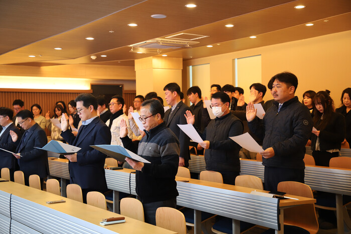| ▲ 시흥산업진흥원은 22일 인권경영에 대한 의지를 표명하고 내부 인식 확산을 위하여 전 직원이 참여한‘인권경영 헌장’ 선포식을 진헝했다 /사진제공=시흥산업진흥원 |