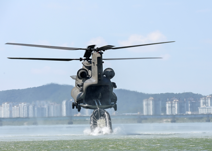 | ▲ 시누크 헬기가 영산강 수면에서 저고도 비행하며 고무보트를 투하하고 있다.(Soft-Duck) (사진 = 해군 3함대 사령부 장석훈상사) |