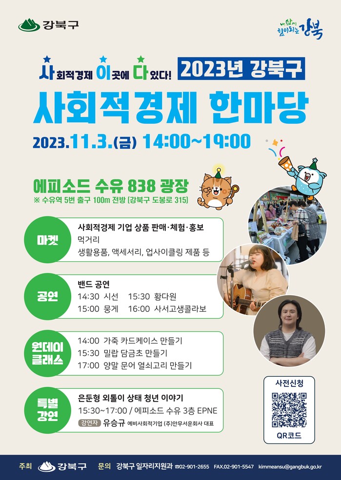 [시민일보 = 홍덕표 기자] 서울 강북구(구청장 이순희)는 사회적경제기업과 주민간의 상호교류 장인 '사회적경제 한마당'을 오는 11월3일 개최한다고 밝혔다.
