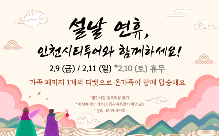 인천 주요 관광지를 편리하게 이동할 수 있는 ‘인천시티투어’ 할인 이벤트도 풍성하다. 설 연휴 중, 2월 9일(금)과 11일(일) 이틀간 진행되는 <온 가족이 함께하는 가족 패키지 이벤트>는 순환형 노선 티켓 1장을 구매하면, 온 가족이 탑승할 수 있는 역대급 혜택을 누릴 수 있다.