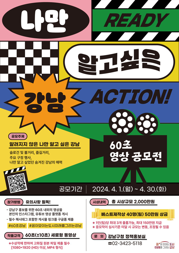 1일 구에 따르면 ▲강남의 볼거리, 즐길거리 ▲강남구 주요 정책·행사 참여 후기 또는 인터뷰 콘텐츠 ▲강남구 슬로건 ‘꿈이 모이는 도시, 미래를 그리는 강남’과 관련된 내용을 자유롭게 표현한 영상을 제작해 개인 SNS 및 영상 플랫폼에 게시하고, 해시태그(#60초강남 #꿈이모이는도시미래를그리는강남)를 붙이면 된다. 공모전 포스터에 있는 QR코드의 구글폼을 통해 게시물 링크를 포함한 신청서를 제출하면 심사를 통해 우수작 40편을 선정한다.
