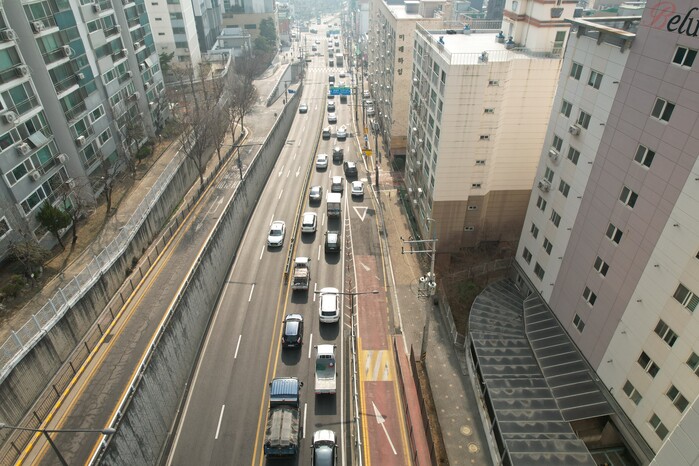 | ▲ 평일 출근 시간대 신사지하차도에서 신사사거리 구간 차량 병목 현상 모습. (사진=은평구청 제공) |