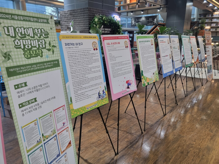 이곳에서는 ‘내 안에 부는 희망 바람’의 글꽃대회 당선작 에세이 6작과 슬로건 5작으로 총 11작품이 전시됐다. 에세이는 '자전거는 내 친구', '삶의 비타민 같은 성동자활' 등 이고 슬로건으로는 나에게 성동자활센터는 '내 인생의 라이브 OST', '삼거리 행복슈퍼마켓', '종합병원', '소중한 꽃과 희망', '상생의 터전'이 있다.
