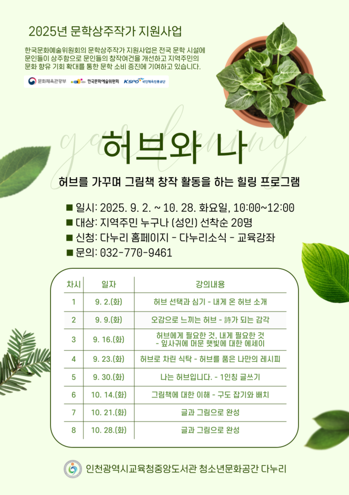 [인천=문찬식 기자] 인천광역시교육청중앙도서관(관장 곽미혜) 청소년문화공간 다누리는 2025년 문학상주작가 지원사업의 일환으로 지역 주민을 위한 생태문학 창작 프로그램 ‘허브와 나’를 9월부터 운영한다.